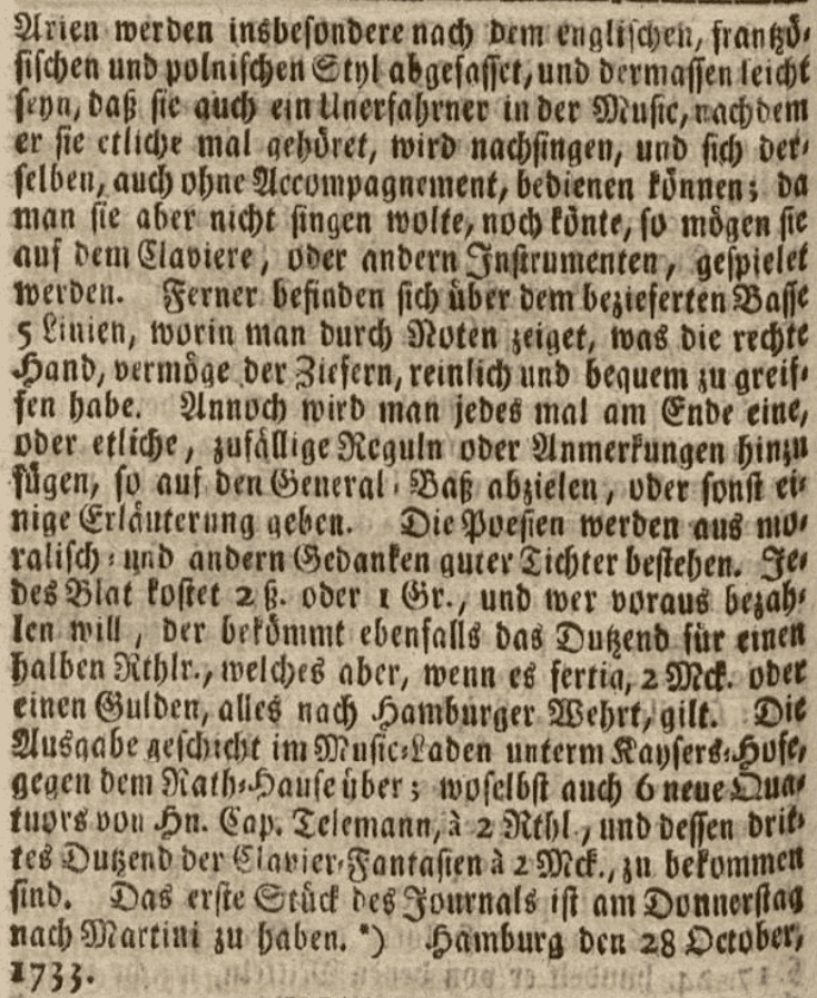 On 28 October 1733, an advertisement written by Telemann himself was published in Hamburgische Berichte von neuen Gelehrten Sachen: