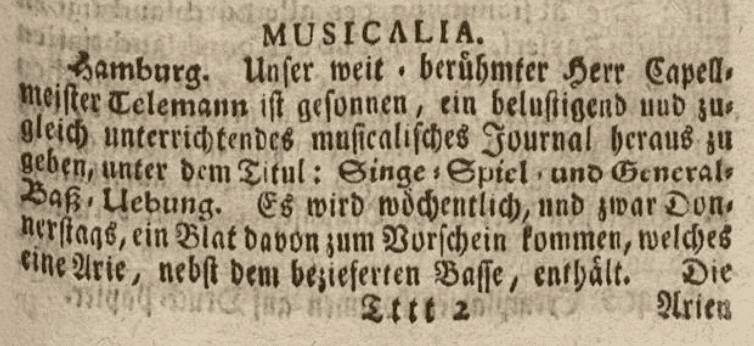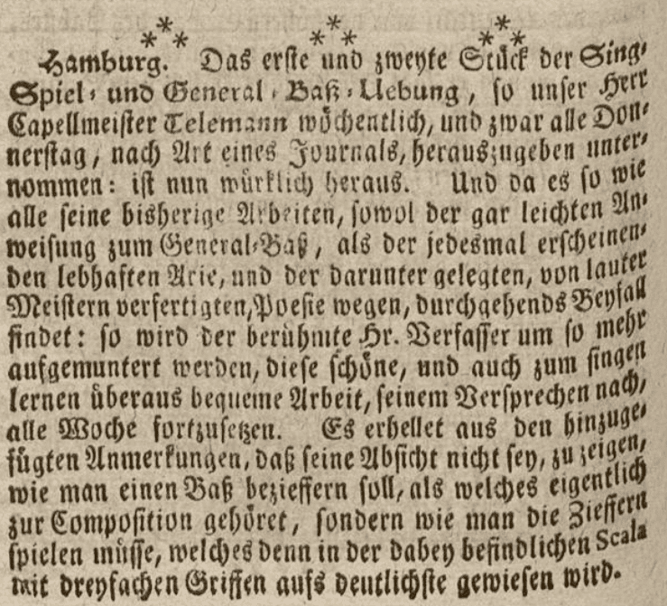 “Hamburg. The first and second pieces of the Singe-, Spiel- und General-Baß-Uebung, which our Kapellmeister Mr. Telemann has undertaken to publish weekly, namely every Thursday, in the manner of a journal, have now actually appeared. And since, like all his previous works, it meets with universal approval, both on account of its very easy instruction in thoroughbass and of the lively aria appearing each time, as well as the poetry set beneath it, composed by excellent masters, the famous author will be all the more encouraged to continue this fine work, which is also extremely convenient for learning to sing, in accordance with his promise, every week. It becomes clear from the appended remarks that his intention is not to show how a bass should be figured, which properly belongs to composition, but rather how one should play the figures, which is demonstrated with the utmost clarity in the accompanying scale with its threefold positions.”