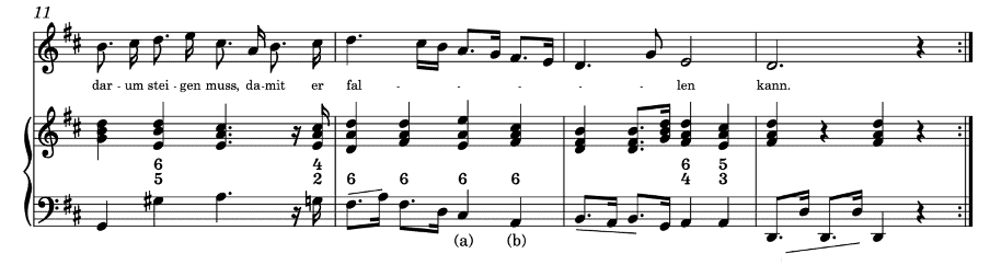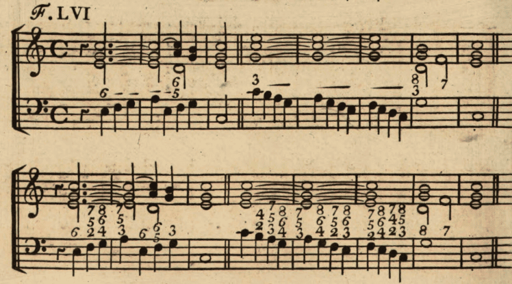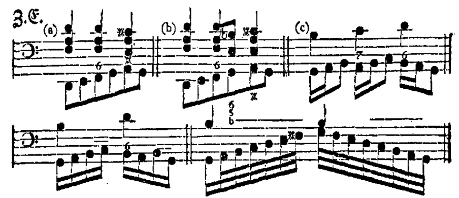 “When the chord of the second occurs in passing [i.e., as the realization of a passing note] and is prepared by the Oberstimme, it requires no special designation, and one may then place only this sign — instead of the otherwise customary figures above it, by which, in all cases (and thus also in this one), it is indicated that the harmony remains from the preceding tone. This also facilitates the playing itself, as has been demonstrated in Example Fig. LVI.” “Wenn der Secunden-Accord im Durchgange durch die Oberstimme präpariret, vorkömmt, so bedarf er keiner besondern Bezeichnung, und man darf alsdenn blos dieses Zeichen — statt der sonst gewöhnlichen Signatur mit Zahlen über ihn setzen, wodurch in allen Fällen, also auch in diesem angedeutet wird, daß die Harmonie vom vorhergehenden Tone liegen bleibt, wie es denn auch das Spielen selbst erleichtert, wie im Exampel Fig. LVI. nachgewiesen worden.”10