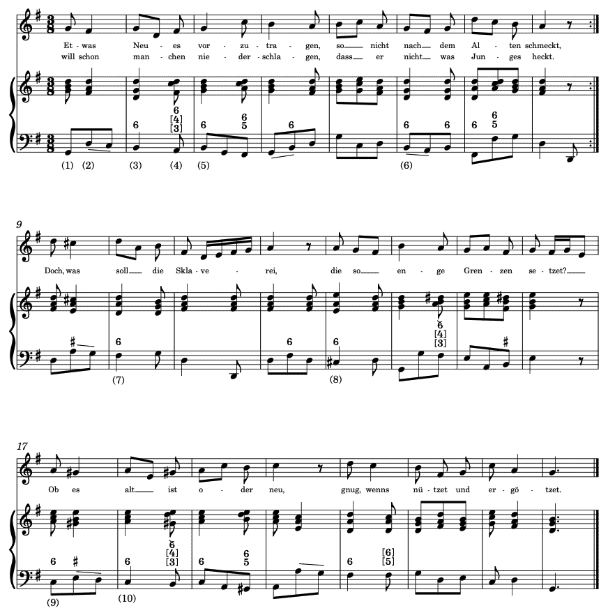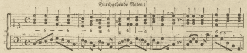 “Durchgehende Noten sind entweder diejenigen, welche den Zwischenraum von einer Consonanz zur andern ausfüllen, oder sie sind harmonisch, wenn sie den Accord zergliedern; und werden nach der Beschaffenheit, die schlimmen Tactglieder, 2—4—6—8 durchgehende Noten genennet. (—) ist das Zeichen.”9