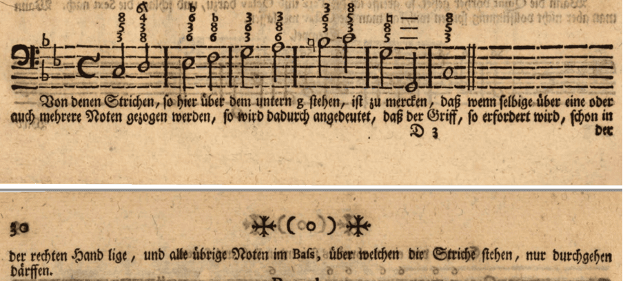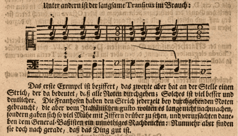“Das erste Exempel ist beziffert, das zweyte aber hat an der Stelle einen Strich, der da bedeutet, daß alle Noten durchgehen; Solches ist viel besser und deutlicher.”2