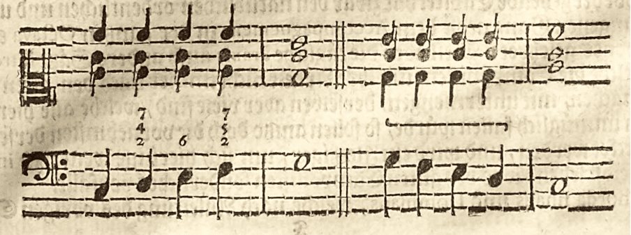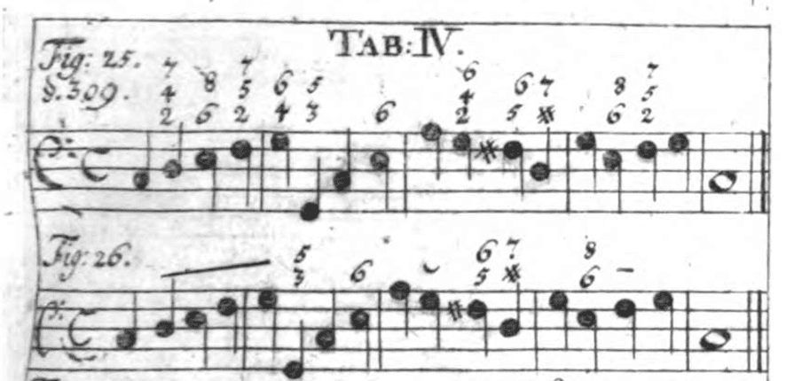 Note how the bass and figurings of the first bar in figure 25 are almost identical to those in Kellner’s musical example. It seems plausible to assume that Adlung was familiar with Kellner’s thoroughbass treatise. (The only difference in the figuring occurs on the third beat, where Adlung adds an “8” above the “6”, possibly indicating e2 in the Oberstimme in this bar, while Kellner gives c2.)