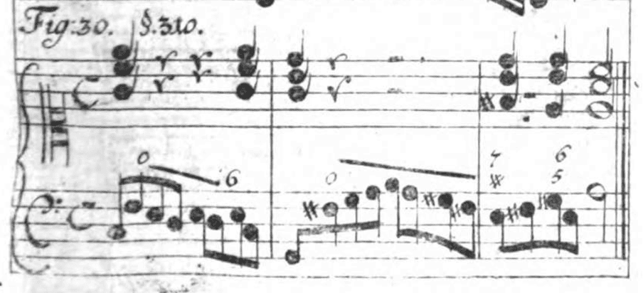 “Es ist ferner bekannt, daß durch das beygeschriebene Wort tasto, oder tasto solo, angedeutet wird, ausser den Baßnoten gar nichts mit zu greifen, man müßte denn Octaven darzu nehmen wollen; und wenn viel Noten nach einander auf gleiche Art zu tractiren, habe ich hierwider nichts einzuwenden, als daß man im Schreiben nicht vergesse entweder durch einen Ziefersatz, oder durch Beschreibung der Buchstaben acc. (das ist: Accompagnement) den Spieler zu erinnern, mit der rechten Hand wiederum Griffe zu machen. Allein, wenn dem Componisten gefallen sollte, bey wenigen Noten die Griffe wegzulassen; da es der Wenigkeit wegen weder thunlich noch bequem sich obiger Worte zu bedienen; so könnte eine überschriebene Null 0 solches andeuten. Ich habe solches Fig. 30 vorstellig gemacht, und wenn nach solcher Null das vorhergehende Zeichen des Queerstrichs folget, bekommen solche Noten auch keine Griffe.”7